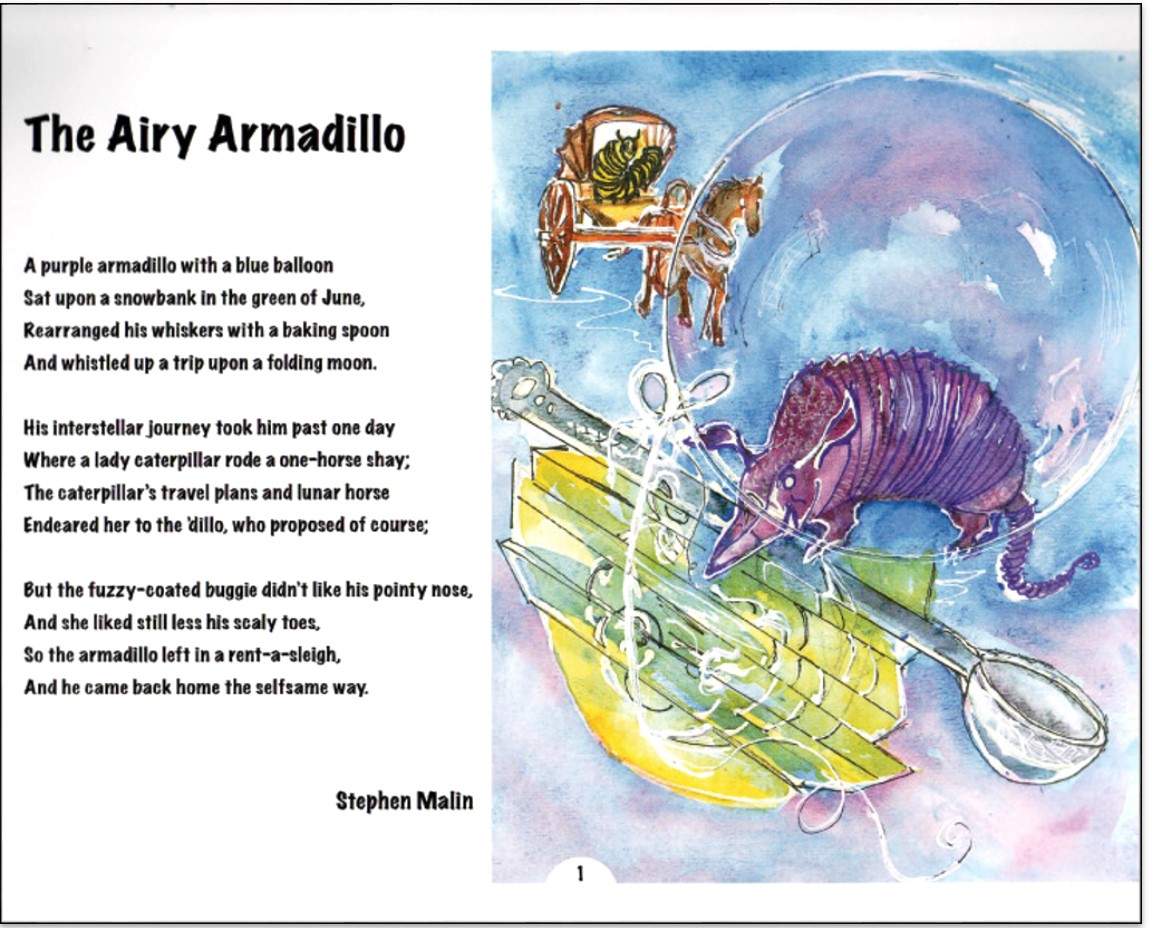 Previous Next Published April 7, 2016 at 1149 × 928 in A Bouquet Of Poems A Bouquet of Poems – The Airy Armadillo by Steven Malin Like Loading...